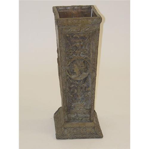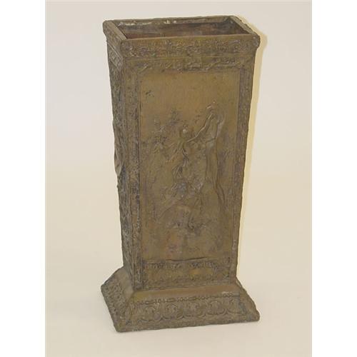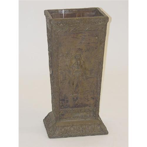 VICTORIAN BRASS UMBRELLA STAND W/ FANCY EMBOSSED BRASS OVER WOOD DEPICTING CLASSICAL WOMEN W/ FLUTE & TAMBOURINE ALONG W/ BUSTS & LEAFY SCROLLS (PROBABLY CONTINENTAL; 26 1/2" T X 13" W X 10" D) - WEAR, LOSSES & IMPERFECTIONS