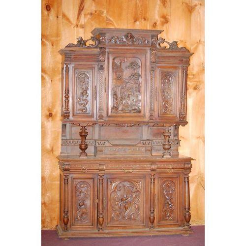 VICTORIAN BREAKFRONT CUPBOARD - CONTINENTAL WALNUT RENAISSANCE REVIVAL STYLE 3-PART CUPBOARD W/ RED MARBLE TOP & EXTRAVAGANT CARVINGS INCL. PEOPLE, FRUIT, GRIFFINS, CABACHONS, ETC. (96" T X 62.5" W X 21.5" D)- WEAR, LOSSES, IMPERFECTIONS