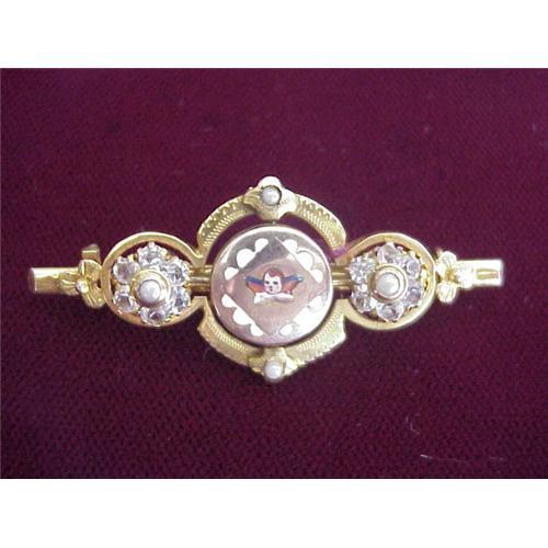 <table width="100%" border="0" cellspacing="0" cellpadding="4"><tr><td><em> </em></td></tr><tr> <td width="100%"> Beautiful Victorian gold brooch with a sweet cherub angel cupid enamelled on gold,please note the images distorst the fine handpainting with delicate features ,with seed pearls and white sapphire stones. The brooch is of high gold content being about 15 ct, it has both rose gold and yellow gold. It has the makers marks on the back FR with a star then OV. It measures about 2 inches by ¾ inches wide in the centre. Has original working c catch which closes securely. In fine condition, perfect to enjoy wearing and adding to your collection of Victorian jewelry. </td></tr><tr> <td> </td></tr><tr> <td>Reference #: GAVJ859</td></tr><tr><td>Condition:Very Fine</td></tr><tr><td>Year:1880-90s</td></tr><tr><td>Title:VICTORIAN BROOCH ENAMEL CHERUB ANGEL</td></tr><tr><td>Location:WA</td></tr></table>
