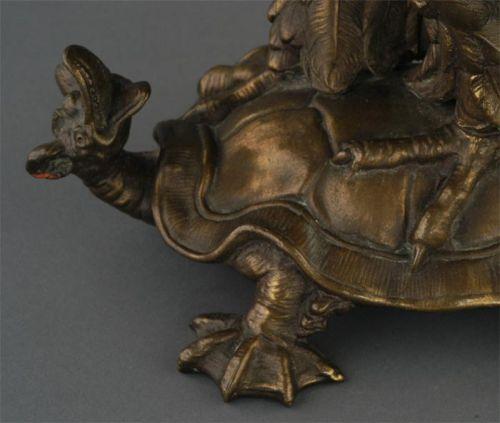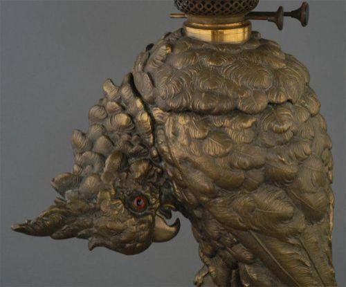 VICTORIAN CAST BRASS COCKATIEL ON TURTLE LAMP, the bird with glass eyes, 25" high overall, 14 1/2" base only, condition: period handpainted shade with small piece near fitter broken and glued back, electrified, late 19th century,