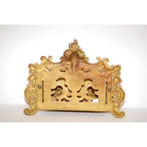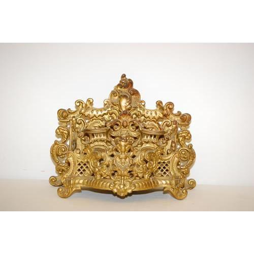 VICTORIAN CAST IRON LETTER HOLDER-FANCY GILT CAST IRON W/ PIERCED FLORAL & SCROLLED DECORATIONS, BOWED FRONT & 2 LETTER COMPARTMENTS MARKED 3070 (8" T X 10 1/4" W X 5" D) - WEAR, OXIDATION, IMPERFECTIONS
