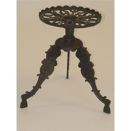VICTORIAN CAST IRON STAND OR TABORET - EXTRA FANCY W/ ROUND PIERCED TOP & 3 LEGS DECORATED W/ SCROLLS, STARS, ETC. & PAINTED BLACK (16" T X 10 1/2" W TOP, 15 3/4" TOE TO TOE) - WEAR, IMPERFECTIONS