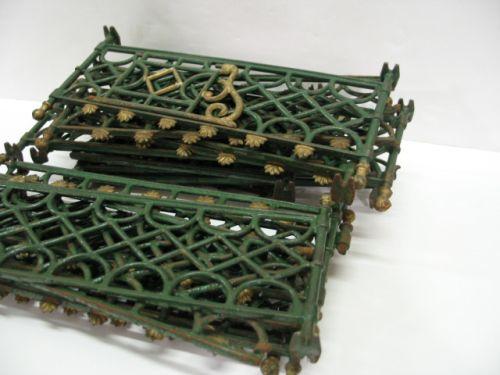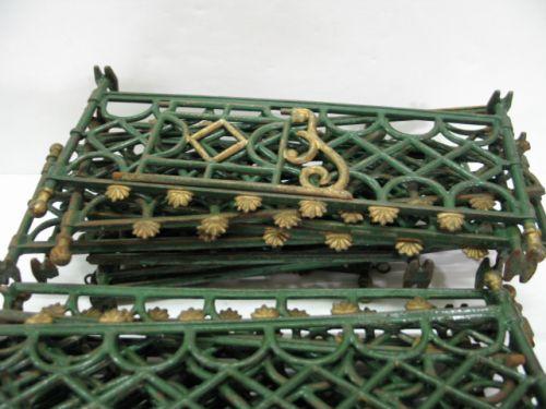 VICTORIAN CHRISTMAS TREE FENCE. Consists of 15 pieces measuring 5.25” H and 11” L. Also consists of four pieces measuring 5.25” H and 8” L. Also consists of two gates. All pieces retain original green and gilt paint.