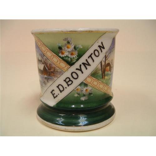 THIS IS E.D.BOYNTON MUG. 2 HAND DECORATED VIEWS AND HIS NAME ON A BANNER.THE GILT HAS ALMOST ALL WORN AWAY.THIS IS A REALY COOL MUG TO HAVE YOUR MORNING COFFEE.