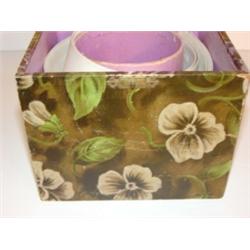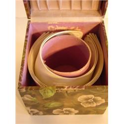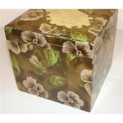 VICTORIAN ERA COLLAR & CUFFS BOX. Box contains period cuffs. Floral decoration. Marked on top of lid "Collar & Cuffs". Original latch & hinges. 5.25" H, 5.5" W, 5.5" D