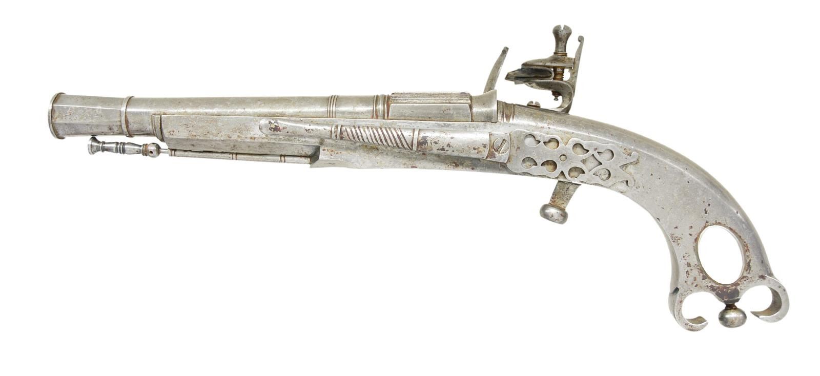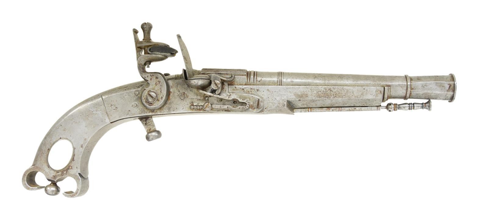METAL PISTOL. Cal. 52. NSN. Bbl. 7 3/4" cast, has oct. flared muzzle. Lock has serpentine cock, unbridled frizzen & file decorated feather spring, pistol w/ iron frame also features ball type trigger, rams horn butt w/ pricker, file decorated belt hook, oval silver escutcheons & fancy turned iron ramrod. CONDITION: metal retaining most bright polish w/ scattered rusting & marks. PROVENANCE: The Estate Collection of Gary Parietti. (01-19691/JS). ANTIQUE. $800-1,200.