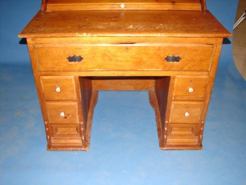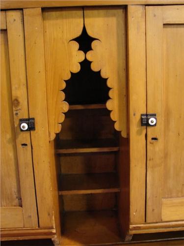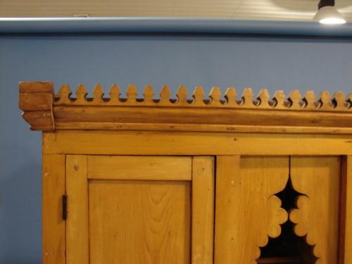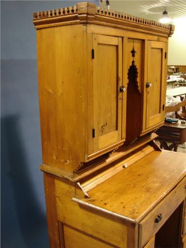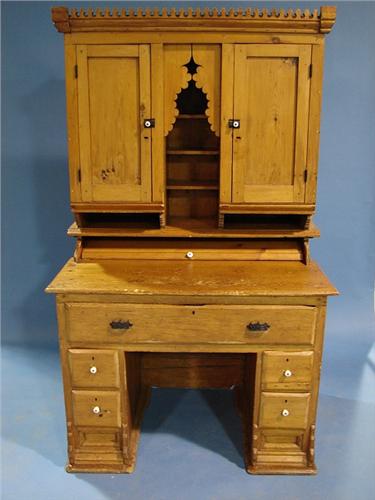 VICTORIAN COUNTRY TWO PIECE SECRETARY. Two pegged panel doors at top over a single drawer over four drawers at bottom. Shelves have saw tooth trim. Cut-out galley at top. Shows major signs of wear and surface scratching. 75” H, 44.5” W, 28” D