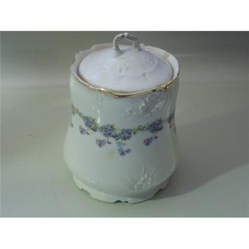BISGUIT JAR HAS A DELICATE LOOK ABOUT IT, IT IS NICELY PAINTED WITH A CIRCLE OF BLUE BELLS AND IT IS IN PERFECT CONDITION. A VERY NICE PIECE OF EARLY PORCELAIN