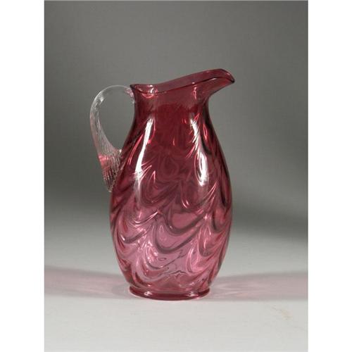 GLASS: Cranberry glass pitcher with optic wave pattern and applied clear handle, late 19th c. 9.25'' H