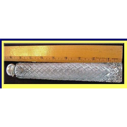 Cylindrical, flattened lay down bottle. Very finely cut old glass of the same period as the American Brilliant Cut Glass (and possibly made here, but glass is not marked, so we do not know). Sterling silver neck and hinged lid. No stopper present. Silver is hallmarked with anchor for Birmingham, lion passant, date letter that appears to be 'b' for 1901 and also a very worn maker's mark.