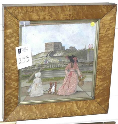 VICTORIAN CUTWORK PICTURE, with birdseye maple frame, 14"x13", 19th century, condition: very good, cupping and small tears at edges, PACKING AND SHIPPING (excluding insurance) $30,