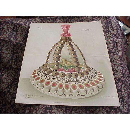 Perfect for the baker or lover of cakes! This is a Victorian original chromolithograph circa 1880s of a very fancy decorated cake, it looks like marzipan and spun sugar trimmings and icing . The colors are rich making this fine Victorian print highly decorative. This is a German litho print . It measures about 15 ½ inches by 12 inches, in perfect condition, but for the right centre have a crease, otherwise perfect. How beautiful to frame or give as a gift. Decorate your kitchen or dining room or restaurant. However you display it, it will bring pleasure.