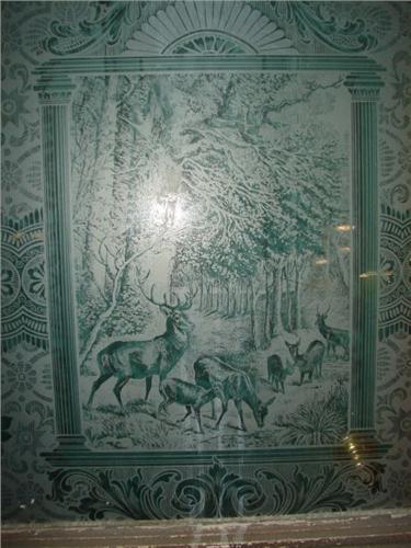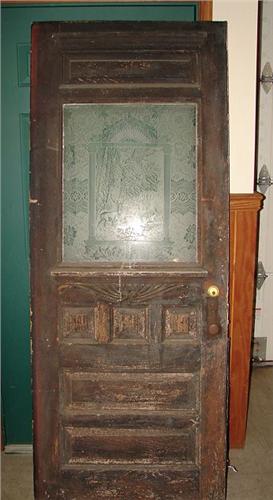 VICTORIAN OAK DOOR WITH ETCHED GLASS INSERT. Glass insert is leaf decorated with scene of group of deer in forest. Door has gingerbread trim and 3 over 2 raised panels at bottom. 79” H, 31.75” W