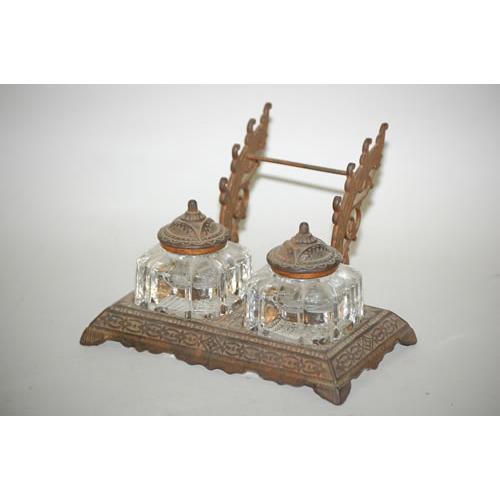 VICTORIAN DOUBLE INKWELL W/ PEN RACK - VICTORIAN<BR>CAST IRON EASTLAKE DESIGN INKWELL FRAME W/ MATCHING<BR>GLASS INSERT WELLS (5" T X 8" W) - WEAR, OXIDATION,<BR>IMPERFECTIONS
