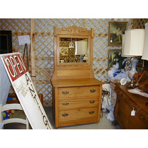 Very nice antique Victorian style dresser that has been restored, the wood grain is of a light oak color, has wooden design key holes and brass drawer handles, one of them is broken, the handle that lifts off is gone. Has a nice wooden carved piece attached above the mirror. I believe it has the original rollers on the dresser. The mirror is in excellent condition. The measurements: it is 77" tall and side to side it is 38" and front to back it is 19 1/4" and it weighs approx. 75-80 lbs. <p>We do have more photographs that we can email if you are interested.