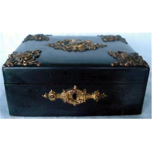 A 19th century Victorian Ebonised Jewel Box, probably made in England. Measures 6inches long, 5inches wide and height is 2 1/2inches high. Rectangular box in dark wood. Front and top have applied ornate brass decorations. Inside is lined with red silk. Box is in good shape.