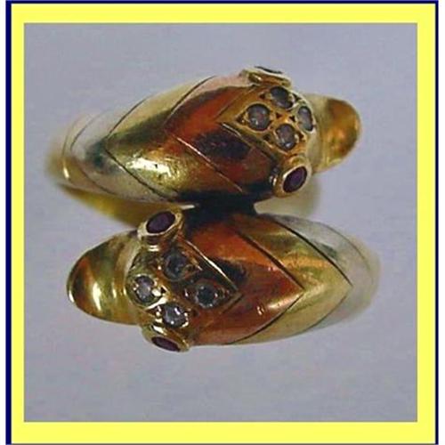 Variation of the typical snake ring - here is a pair of snakes with heads passing each other. Nice engraved detail. Set with a diamond shaped set of 4 diamonds on each head and with ruby eyes. Very elegant and beautiful workmanship. <P>