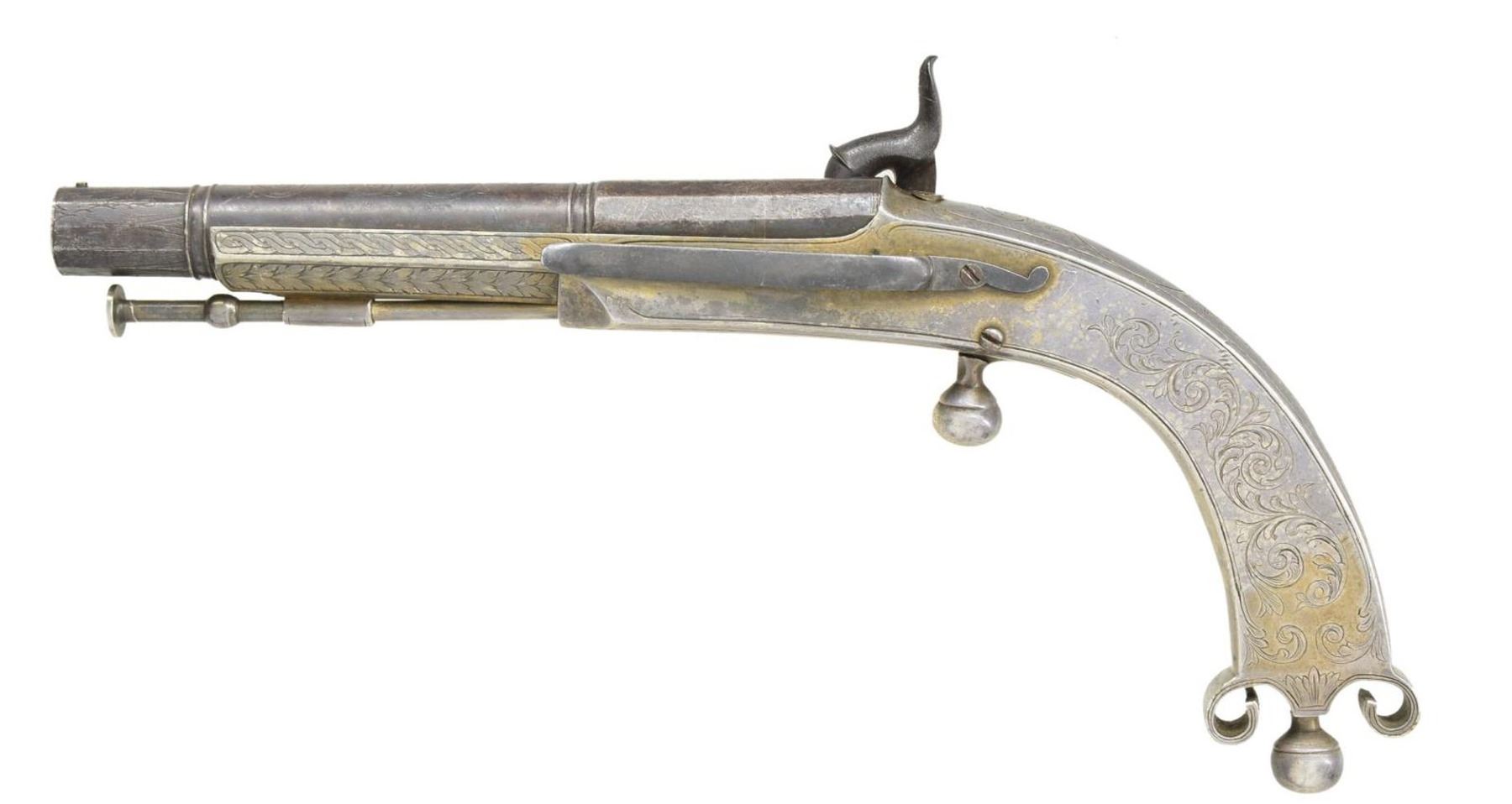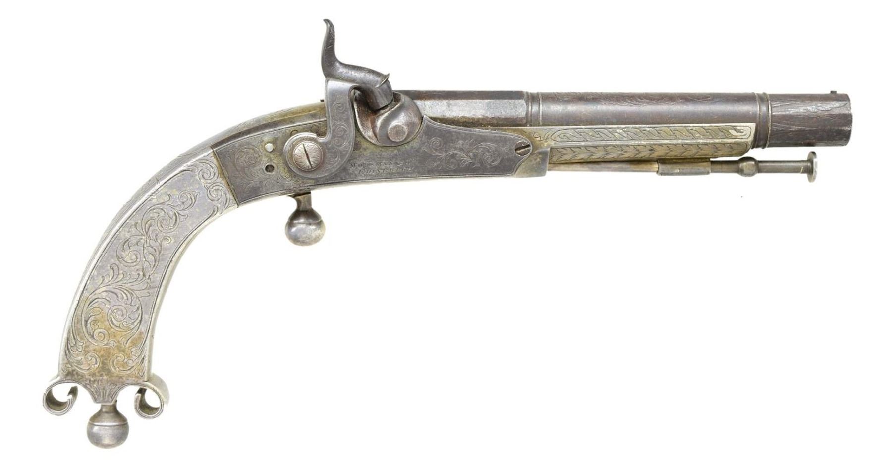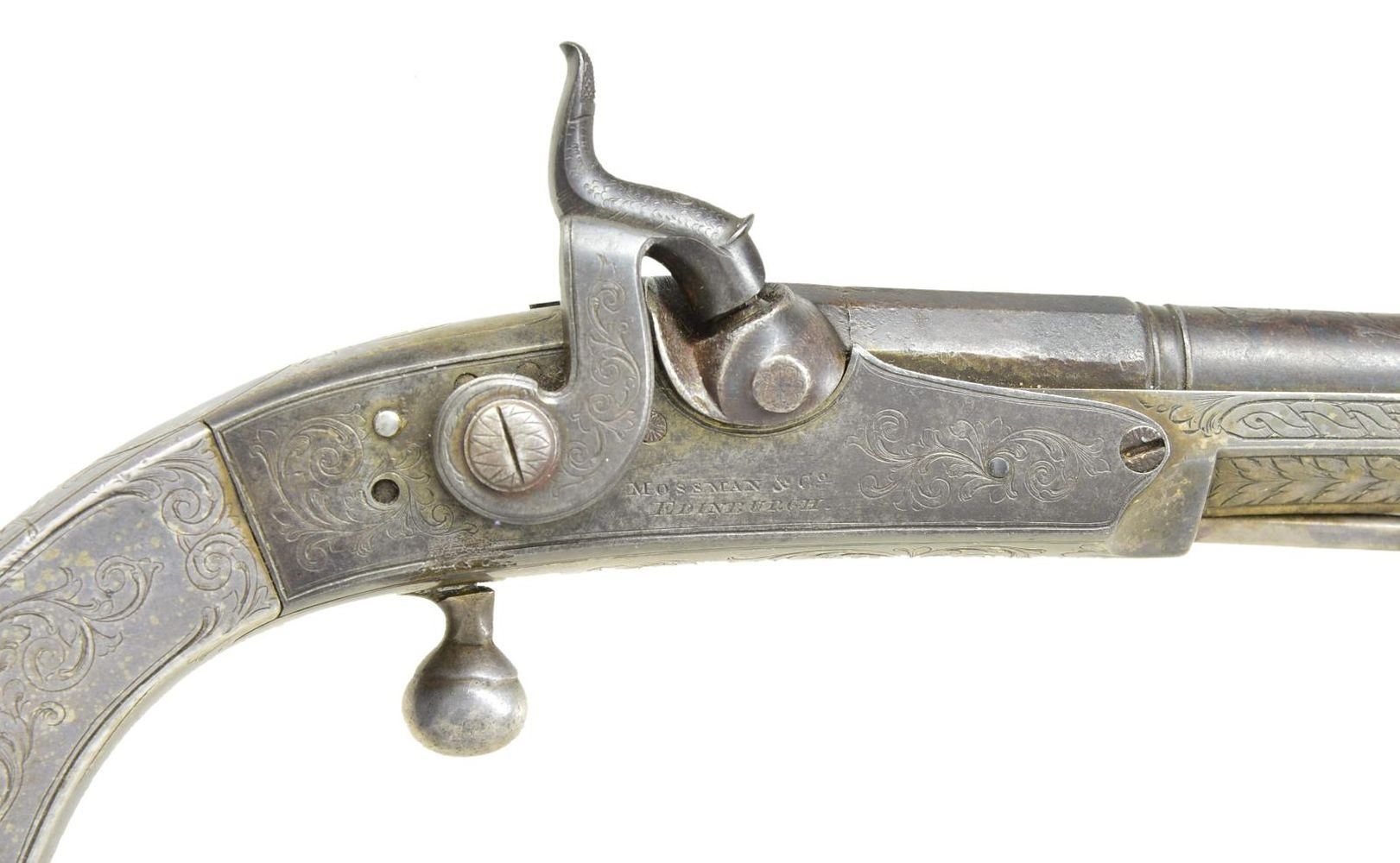 BY MOSSMAN & COMPANY OF EDINBURGH. Cal. 47. NSN. Mossman & Co. were jewelers known to have been working in Edinburgh in 1824. This pistol probably dates from some time after that date, with the popularity and resurgance of highland dress championed by Queen Victoria & Prince Albert. Pistol has 6 1/8" rnd. bbl. w/ decorative turnings & octagonal breech section. Bbl. is scroll-engraved. The nicely shaped front spring percussion lock has a flat-faced serpentine hammer. Lock & hammer are also nicely scroll-engraved. "Mossman & Co." and "Edinburgh" are at the center of the lockplate. Grip stock of German silver has a ball trigger without guard, a ram's horn butt, and a ball-shaped pricker matching trigger. A steel belthook is affixed to the left side, and a turned steel ramrod is held by one plain pipe. Grip frame is engraved w/ near-full coverage and a large open scroll within line borders. Front portion of the stock has geometric & foliate engravings. CONDITION: good to very good. Bbl. and lock retain traces of original blue but are mostly dark brown w/ gray highlights. Grip frame is nicely toned but does show some wear & scratches, mostly on the right side. Bore is rough. Lock is operable. (01-21033/MGM). CURIO. $2,000-4,000.