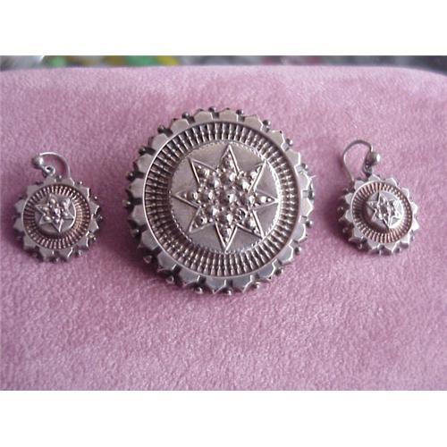 <tr><td>Title:VICTORIAN ETRUSCAN SILVER EARRINGS & BROOCH SET</td></tr>