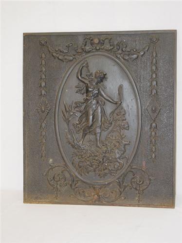 VICTORIAN FIGURAL CAST IRON FIREPLACE OR STOVE PANEL W/ A RAISED FIGURE OF A LADY ARCHER W/ QUIVER & BOW IN AN OVAL CARTOUCHE W/ RIBBONS-W. SHARP & SON DESIGN, 1895 (25" X 22") - PAINTED BLACK, RUST, IMPERFECTIONS
