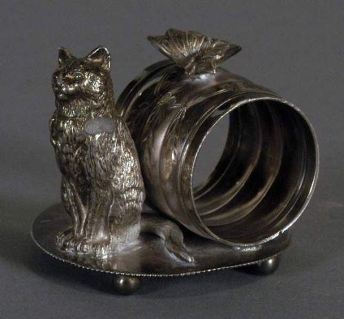 VICTORIAN FIGURAL NAPKIN RING Cat with butterfly, Pairpoint Mfg. #4923, 65mm high, , CONDITION REPORT: Excellent except for soldering mark on shoulder. PACKING AND SHIPPING excl. insurance w/i Contintental U.S. $20 excluding insurance within Continental U.S., multiple lots can be combined at a discount.