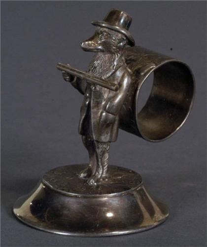 VICTORIAN FIGURAL NAPKIN RING Fox in hat and coat holding rod, Hartford Silver #651, 95mm high, CONDITION REPORT: Excellent. PACKING AND SHIPPING excl. insurance w/i Contintental U.S. $20 excluding insurance within Continental U.S., multiple lots can be combined at a discount.