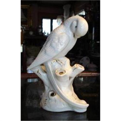 GORGEOUS VICTORIAN ERA FIGURAL VASE DEPICTING WHITE PARROT, EXCELLENT DETAIL AND VERY PLEASING FIGURINE TO LOOK AT IT - THE BIRD IS PERCHED ON THE STUMP OF THE TREE AND IN FRONT HAS 3 OPENINGS FOR THE SINGLE FLOWER AND IN THE BACK BIGGER OPENING - MADE FROM MILKY WHITE CHINA HIGHLIGHTED WITH GOLD AND SIGNED "GERMANY" 3491 - IT STANDS 6 1/4" HIGH EXCELLENT CONDITION FREE OF CHIPS OR CRACKS, US BUYER TO PAY 7.00 FOR SHIPPING PLUS INSURANCE.THANKS.