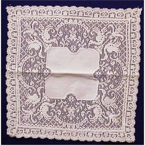 Beautiful filet lace centerpiece,depicting flowers and birds, measures about 10 1/2" square, in excellent condition, How lovely to use or enjoy decorating with! US Buyer to pay 3.00 for shipping plus insurance,Thank You.