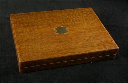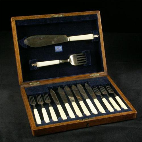 VICTORIAN FISH SET: A six place English silverplated fish set with bone handles, six forks, six knives, fish knife, and fish fork in the original white English oak box sold by ''Wm. Greenwood Watchmaker and Jewelry, Leeds''. Hallmarked, A & D, possibly Allen & Darwin, Charles James Allen & Sidney Darwin silversmiths, end of 19th c. beginning 20th c. Box measures 14 1/2'' x 10 3/8''. A heat indentation noted on the underside of one fork.