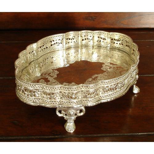 <tr><td>Title:VICTORIAN FOOTED EMBOSSED SILVER SERVING TRAY</td></tr>