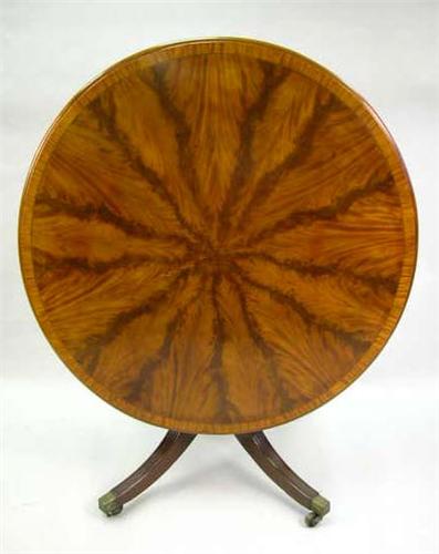 VICTORIAN FRAME MAHOGANY VENEERED CIRCULAR CENTER TABLE; English, the radiating veneered titling top above reeded downswept legs, brass caps and casters (various repairs) 28"h x 46"d
