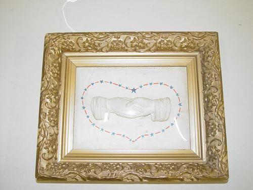 VICTORIAN FRAMED TRIBUTE IN SHADOW BOX FRAME-PARIAN OR PLASTER CLASPED HANDS ON A WATERCOLOR BACKGROUND OF RED & BLUE STAR IN A HEART SHAPE (9 1/2" X 11 1/2") - CHIPS TO FRAME, SOILING