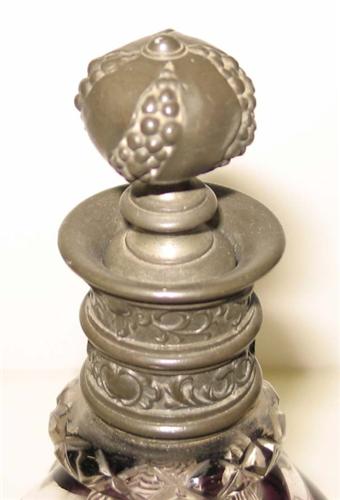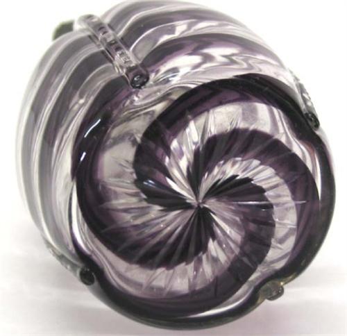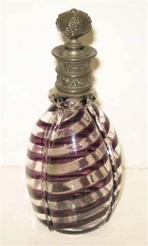 VICTORIAN GLASS OIL BOTTLE. Clear and purple amethyst glass swirl design. Silver plate top and stopper. 6.5” H