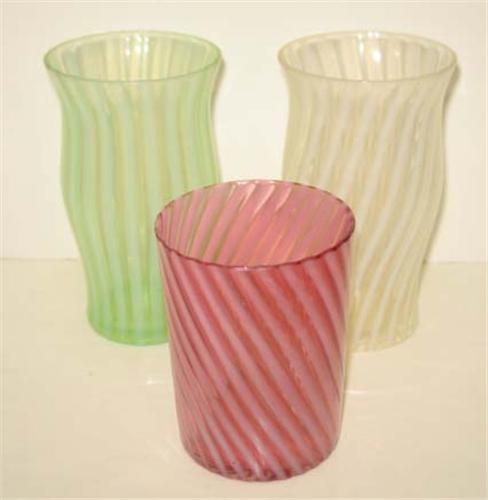 THREE VICTORIAN GLASS TUMBLERS. Consists of one cranberry & opalescent glass tumbler. Shows roughness along top rim. 3.75” H. Consists of one light green and opalescent glass tumbler with bulbous shape. 5” H. Also consists of one clear and opalescent glass tumbler with bulbous shape. 5” H.
