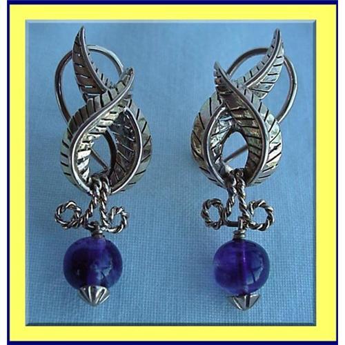 Overlapping elongated leaves rise up on the ear-lobe. A round amethyst bead in gold mount dangles from the bottom at a level below the ear lobe. Look stunning when worn.