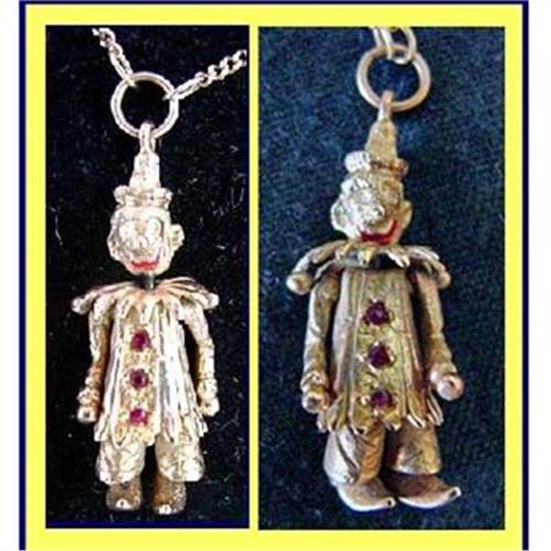 Very rare 19th century, Victorian gold clown charm made of gold, rubies and enamel.Either 1824 or 1864. Almost all parts move. Comes with gold chain.<BR>Clown measures 1 1/4inch, excluding chain and loop.Total length of chain is about 16 1/2inches. chian is most likely a later addition and is marked 14K.<BR>Smiling clown with big pointy feet (that tremble as he moves), huge pointy collar that sways as head and body move back and forward and tunic set with 3 genuine rubies of a wonderful deep red.<BR>Smiling face with red enamel mouth, white enamel eyes and big pointy cap. Arms also move backwards and forwards. <BR>Back is hallmarked, gold mark 9.375, I believe for London with date letter i (either 1824 or 1864) and maker looks like ZLD. <BR>Excellent condition.