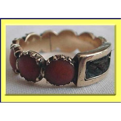Antique Victorian Mourning jewelry, gold ring set with corals and hair. Probably made in England, 1850-90.