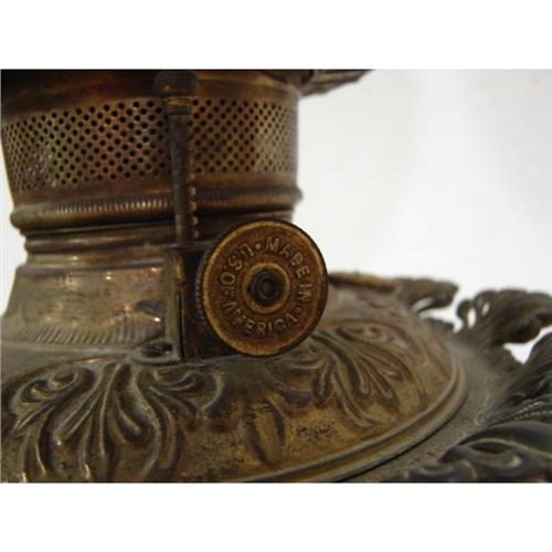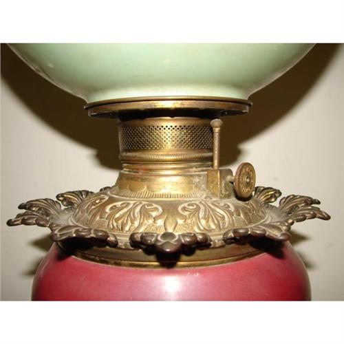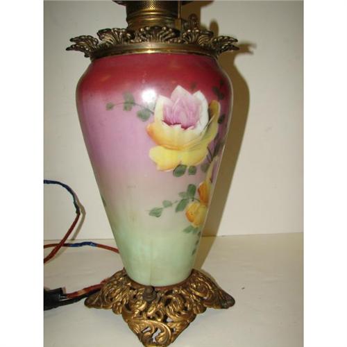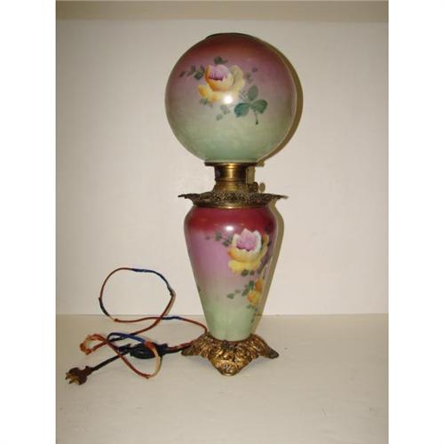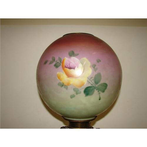 VICTORIAN GONE WITH THE WIND LAMP. Minor chips to base of glass globe and font. Overall good condition. Needs to be rewired. Overall 26” high.