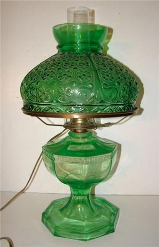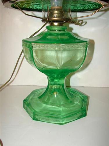 VICTORIAN GREEN GLASS TABLE LAMP. Green glass base, bowl, & shade. Greek key pattern on bowl. Shade has relief decorated circular flower design throughout. Clear glass chimney. Electrified. 20" H to top of chimney.