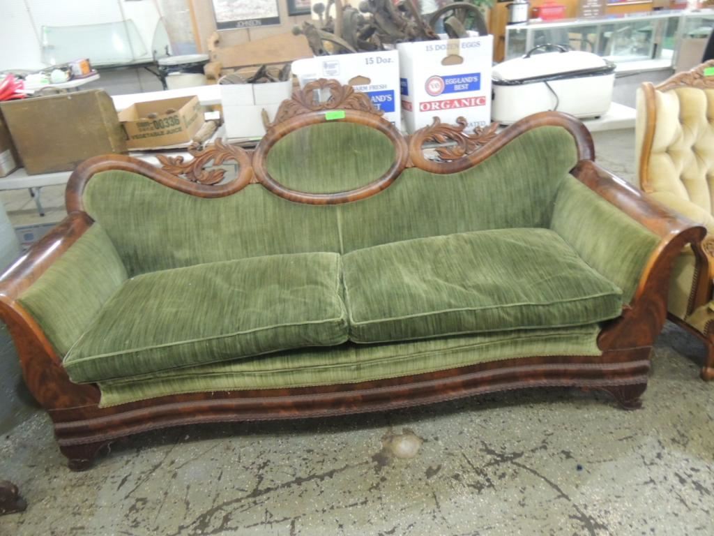 EXQUISITE REFINISHED AND UPHOLSTERED IN 1967. GEORGOUS WOOD DETAIL. BEAUTIFUL SOFA. FEATHER FILLED SEATS. DOWN SEATS CUSHIONS. AS SHOWN. SEE PHOTO FOR MORE DETAILS