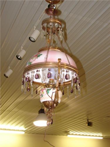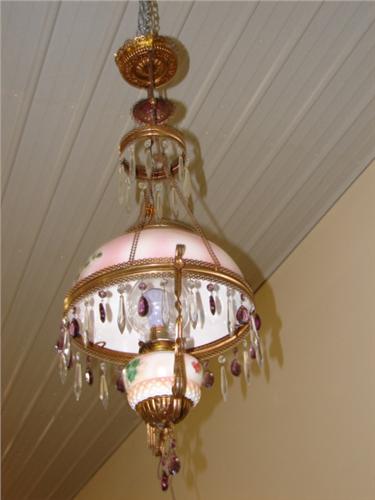 VICTORIAN HANGING CHANDELIER. Floral decorated and pink shade and bowl. Has prisms.