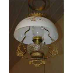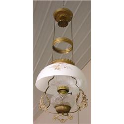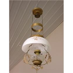 VICTORIAN BRASS HANGING LAMP. Floral decorated white glass shade. Clear glass bowl.