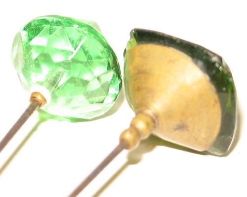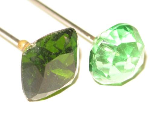 PAIR OF LADIES’ VICTORIAN HAT PINS. Both are decorated at top with large green colored stones. 8” & 10.5” L