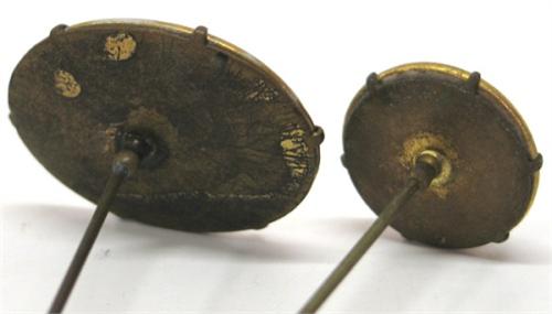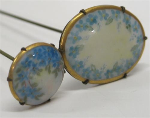 PAIR OF LADIES’ VICTORIAN HAT PINS. Both are decorated with hand blue hand painted floral decoration on porcelain tops. 9.25” & 9.75” L