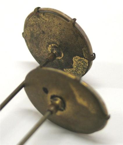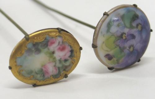 PAIR OF LADIES’ VICTORIAN HAT PINS. One is pink floral decorated on porcelain top and one is purple floral decorated on porcelain top. 8” & 8.5” L