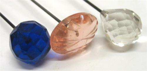 LOT OF THREE LADIES’ VICTORIAN HAT PINS. Consists of one decorated with blue colored stone, one decorated with clear colored stone, and one decorated with pink colored stone at top. 8.5”, 8.5”, & 10.5” L