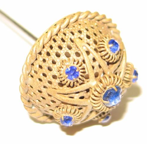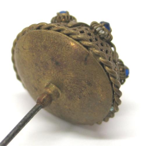 LADIES’ VICTORIAN HAT PIN. Decorated at top with 6 blue colored stones with brass top. 10.5” L
