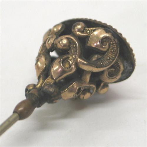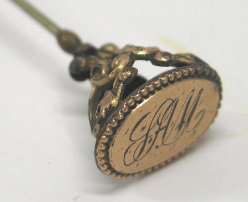 LADIES’ VICTORIAN HAT PIN. Decorated with ornate brass top and monogrammed “PAM”. 8.5” L