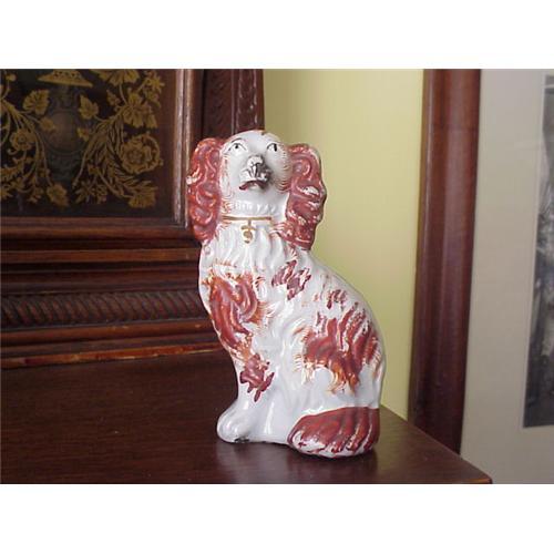 Fabulous Victorian King Charles Spaniel Staffordshire dog figurine. This circa 1850s small Staffordshire spaniel stands 5 ¼ inches high with wonderful original hand painting in gold and russet, some rubbing which is normal for this age. Beautiful face on the sweet Spaniel. A lovely Staffordshire dog to add to your collection.