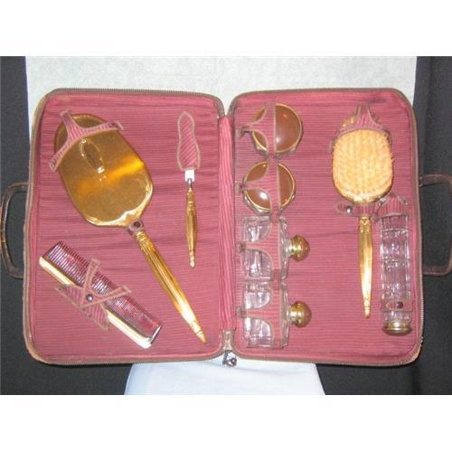 TRUELY A WONDERFUL TRAVEL DRESSER CASE. THE CASE IS IN BROWN LEATHER WITH A ZIPPER, INSIDE THE CLOTH IS OF MORREAU SILK. 9 PIECES IN ALL. THE HAND HELD, MIRROR, BRUSH, COMB, NAIL FILE AND 5 GLASS BOTTLES WITH ENAMEL LIDS. IT DOES NOT APPEAR TO HAVE BEEN USED THAT MUCH, CAME FROM A ESTATE IN CHICAGO, PACKED AWAY IN A DRESSER.THE DESIGN ON THE PIECES IS VERY DELICATE AND THE GILDING IS ALL THERE. CONDITION IS VERY VERY NICE.